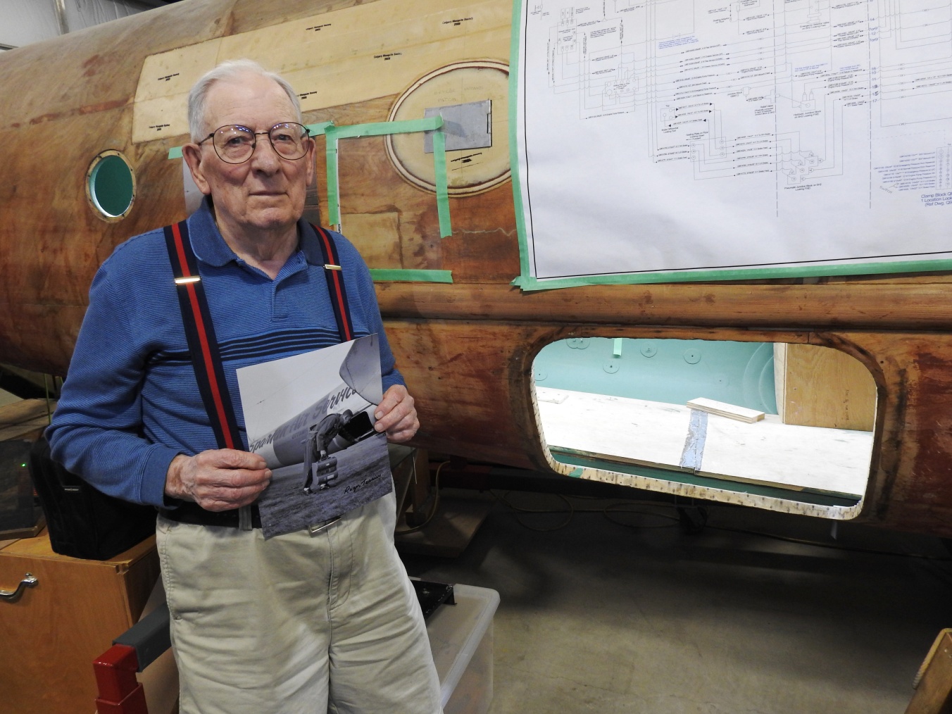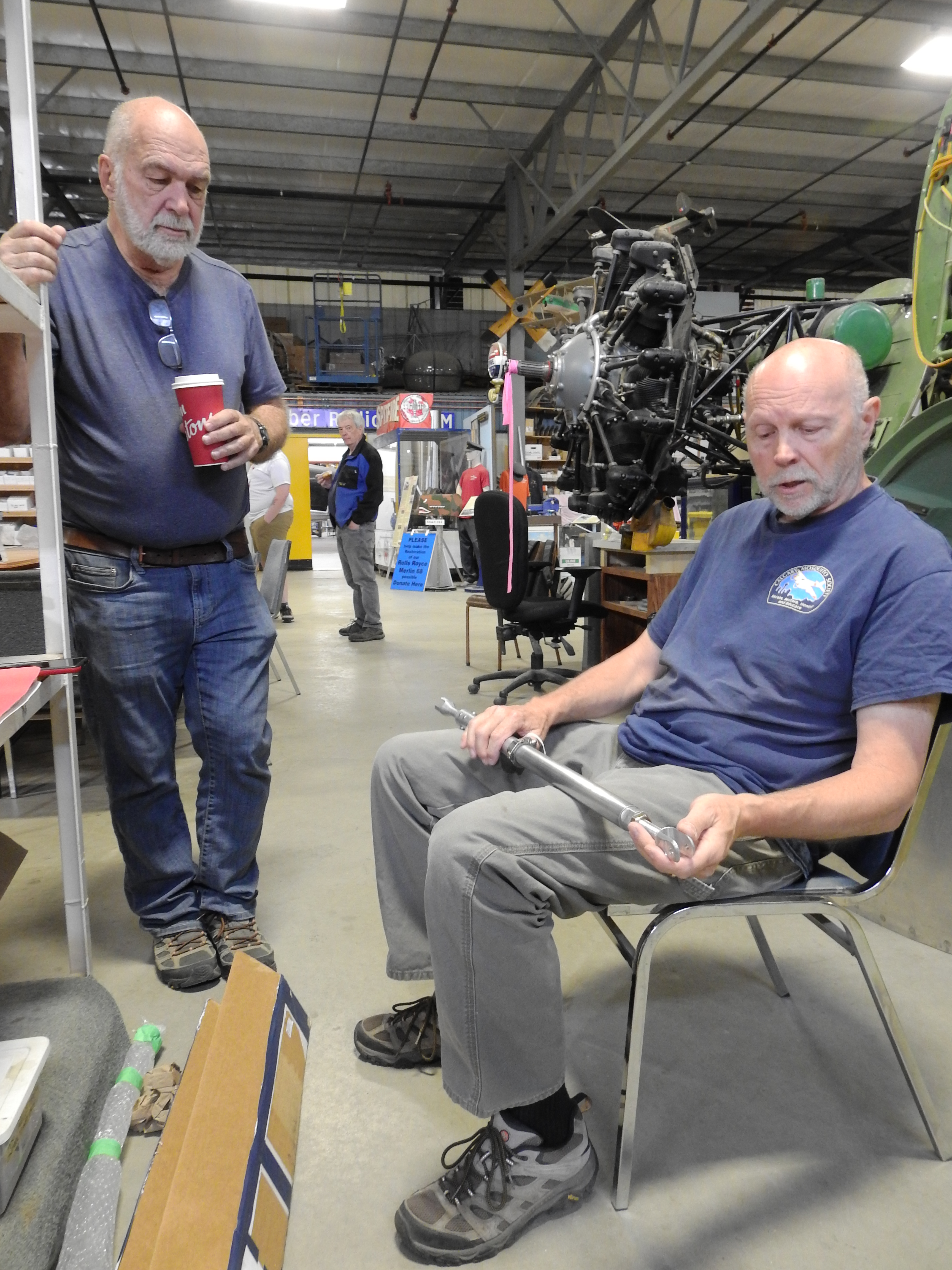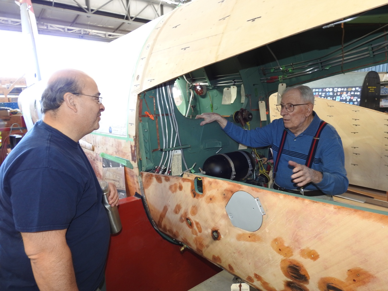 In late June father and son Tessier made a day trip to come visit us. Rear fuselage and camera specialist Don H. had a laundry list of questions for Roger to add details for restoring the camera operator's position. Beyond that, we were thrilled to listen to Roger's stories of the 'good old days', and to show him our work on his old mount. Roger was just eighteen years old when he joined Spartan. He worked for them for three years, which included a stint in Colombia when Spartan had a contract to photo-map the country in 1958. This was of special interest to our undercarriage specialist Jaimie G. who hails from Colombia. My favourite moment of the day was when Roger started to talk about his time in Colombia and he turned to his son and told him to take a walk so he could tell some stories that were not suitable for a son's ears. It was a very cool day for all parties and we extend a huge thanks to Roger and John Tessier for making the effort and supporting our project in this invaluable fashion.