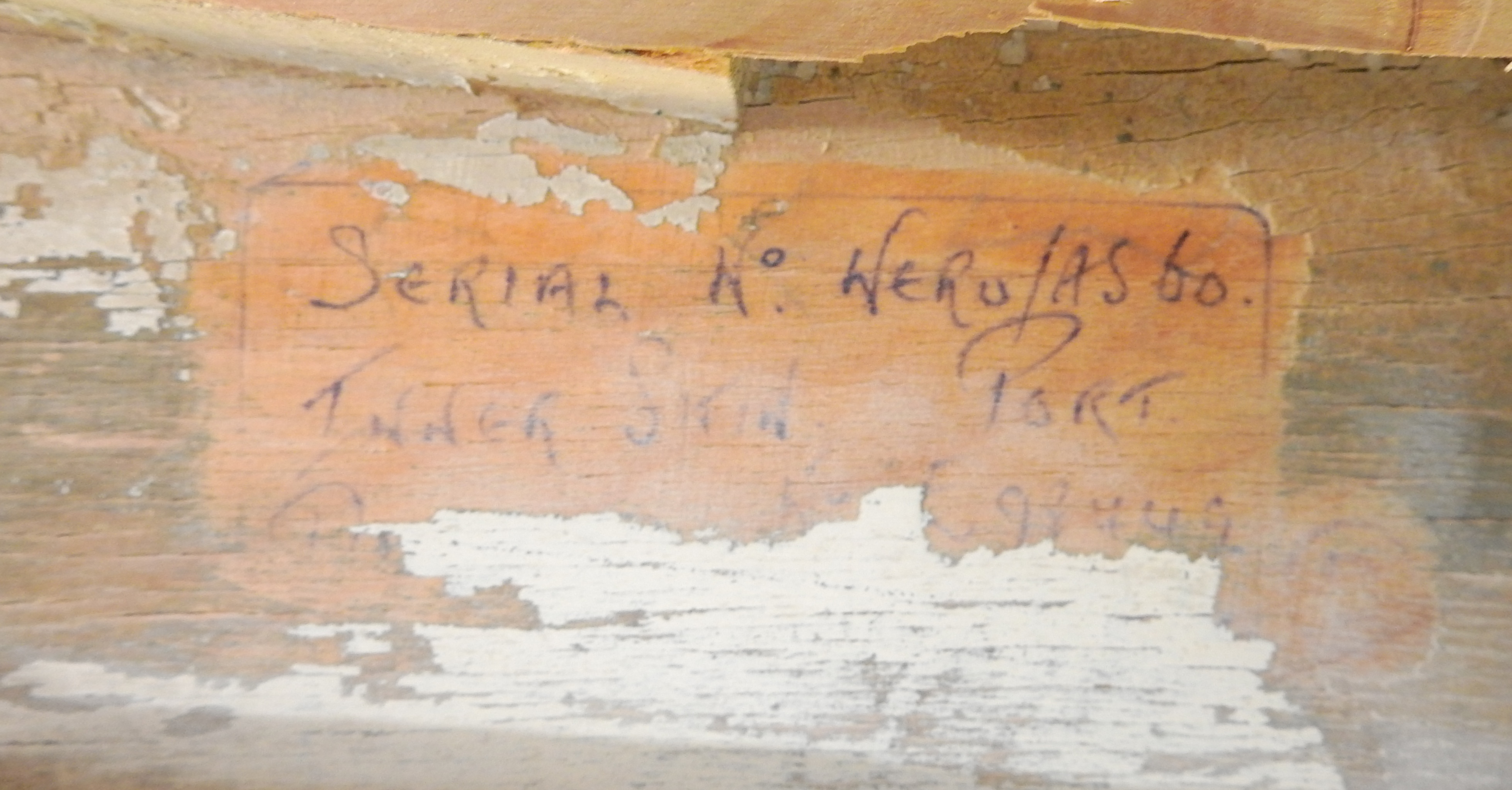 While chipping away at 80 year old paint between the wing stringers near the rear spar, Ashtyn discovered a hand pencilled note. We are careful to photograph all such items and if they appear significant, we will varnish rather than paint over them as we did on the fuel tank panels on the underside of the wing. Speaking of such panels, thanks to many hands making light work, they are all scraped clean and repainted, having been returned to storage until it comes time for new fabric and installation.