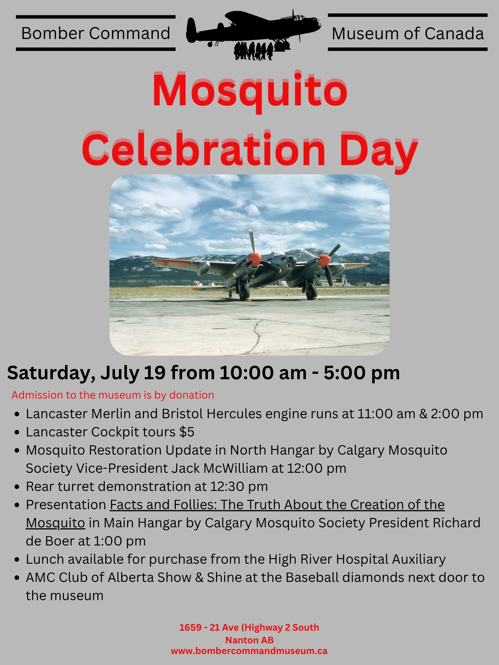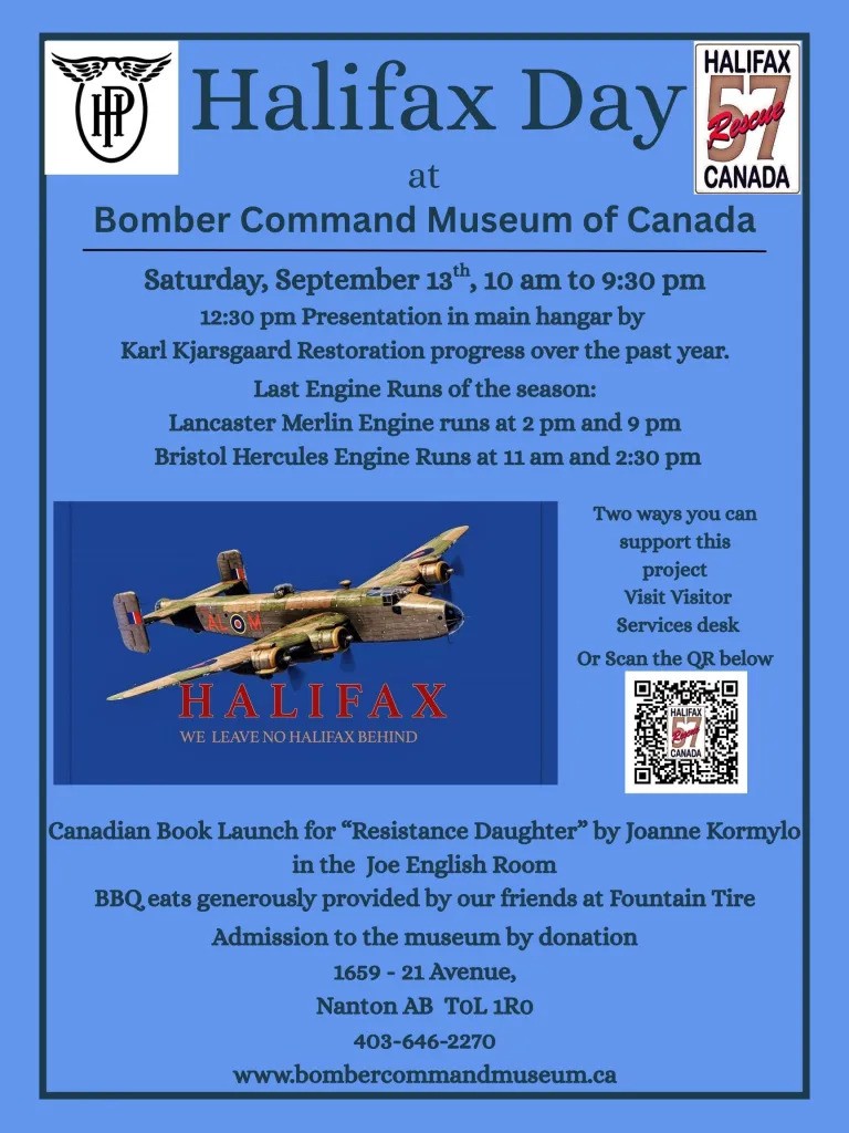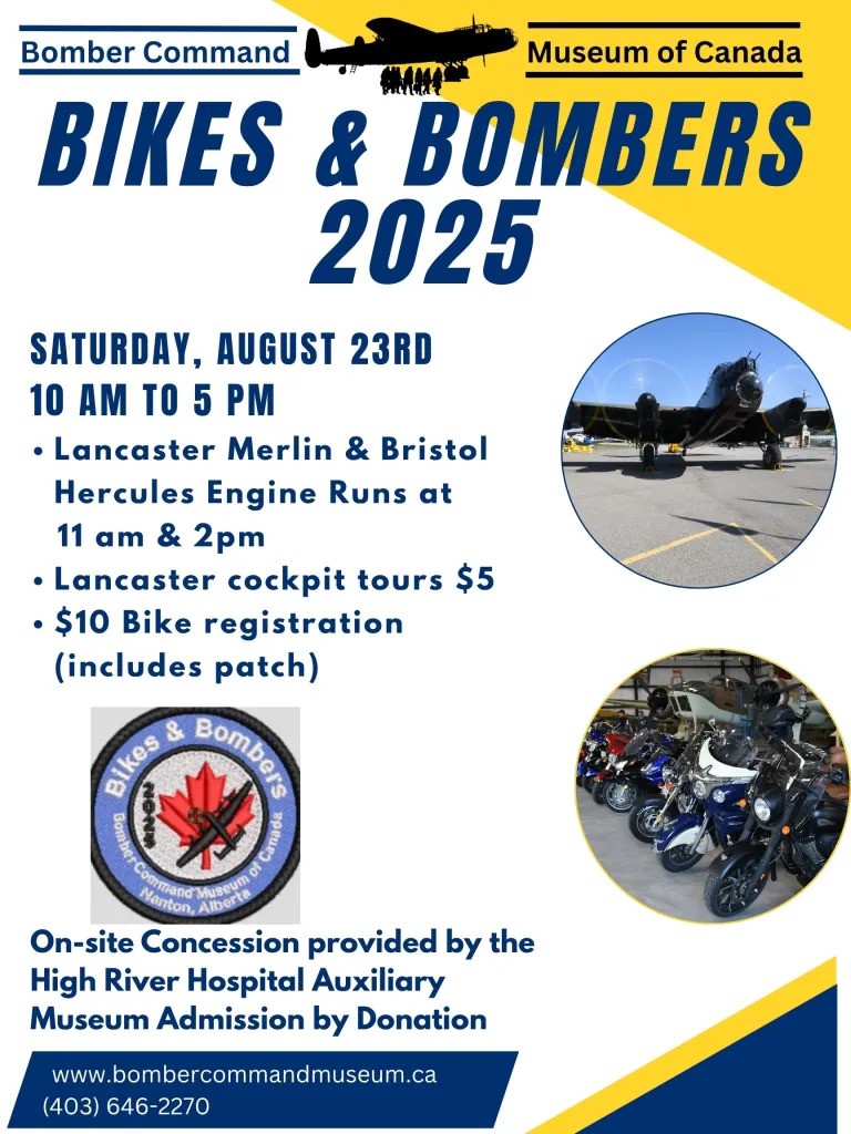 Next on the event day calendar was Heritage and Nanton Parade Day on August 4. This was followed up with the annual 'Bikes and Bombers' on August 23, with the season wrapping up on September 13 with an afternoon talk, an evening book launch and a Lancaster night run as part of Halifax Day. As always Mosquito Society members split their time and energy into selling merch, talking to guests and visitors, and continuing restoration work; all of which makes for an exciting, fulfilling and exhausting day.