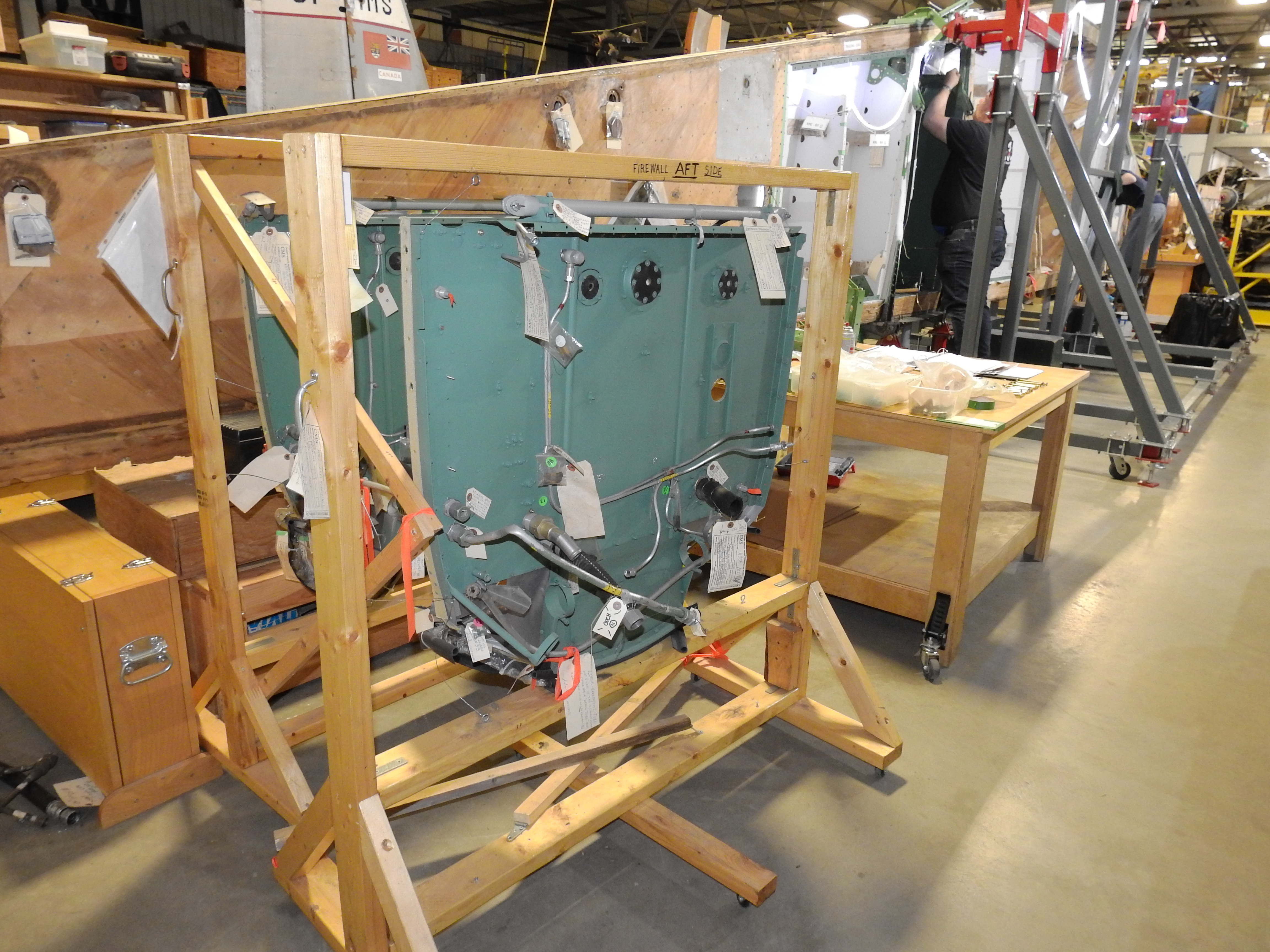 It's appropriate to start this section with some thanks and acknowledgment to our donors and network partners who contribute to the success of our restoration efforts. Thanks to Stewart Roberts of Thunder Bay, ON for donating some of his late uncle's artifacts, including a DH Canada wartime desktop model of a Mosquito, and an aircraft crash axe. As it turns out, our airplane sported a second one of these for the camera operator in the rear fuselage. Interestingly, former Spartan camera operator Roger Tessier, during his visit earlier in the year, mentioned how unlikely it was that one could hack their way out of the fuselage with the crash axe as during training back in 1954, he discovered that after whacking the balsa sandwiched birch ply fuselage, said axe bounced back at one's face with the same speed and force with which one swung it at the airplane!