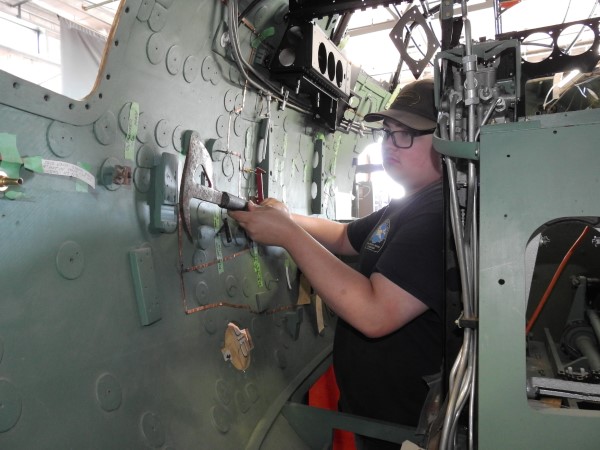 A number of regular visitors have commented on how much has changed since their last visit. So, while the glory boys work the visible elements of our project, the unsung heroes grind on. Among others, this includes Alan W., board members Colette P., and Michael H. and new volunteer Ashtyn R. who continue with cleaning, repairing and installing the copper grounding strips in the fuel bays.