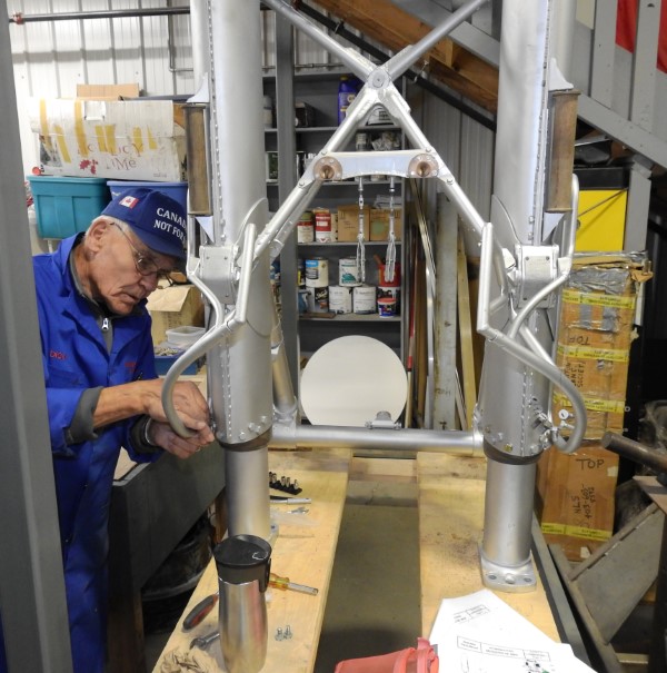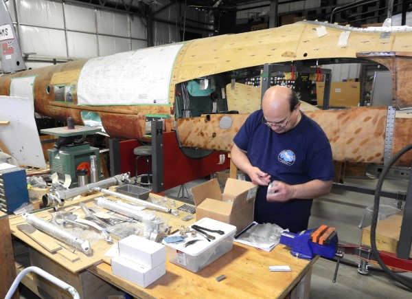 When not assisting Andy, Dick S. is busy putting heli-coil inserts into the lower landing gear as some threads inside the phenolic piston cap are stripped out. We have looked into removing another piston cap from our spare undercarriage legs, but this fix seems to be the least intrusive. Meanwhile Jaime G. is busy working on the second main gear leg assembly, including having to replace some large rivets with bolts and looking for various replacement bits we used to finish the first leg.
